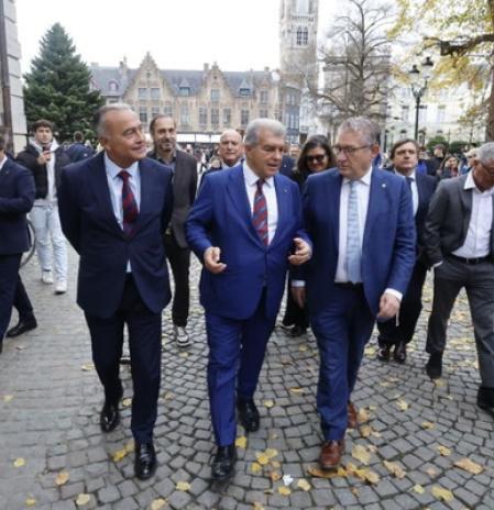 接待仪式结束后,巴萨代表团与市长一起步行十分钟左右,穿过了布满鹅卵石街道的历史中心区域,沿途是标志性的运河和中世纪建筑,这使得布鲁日成为比利时最具代表性的城市之一。轻松的氛围让拉波尔塔得以回应一些在场球迷的问候,他们在主席漫步市中心时向他喊话。